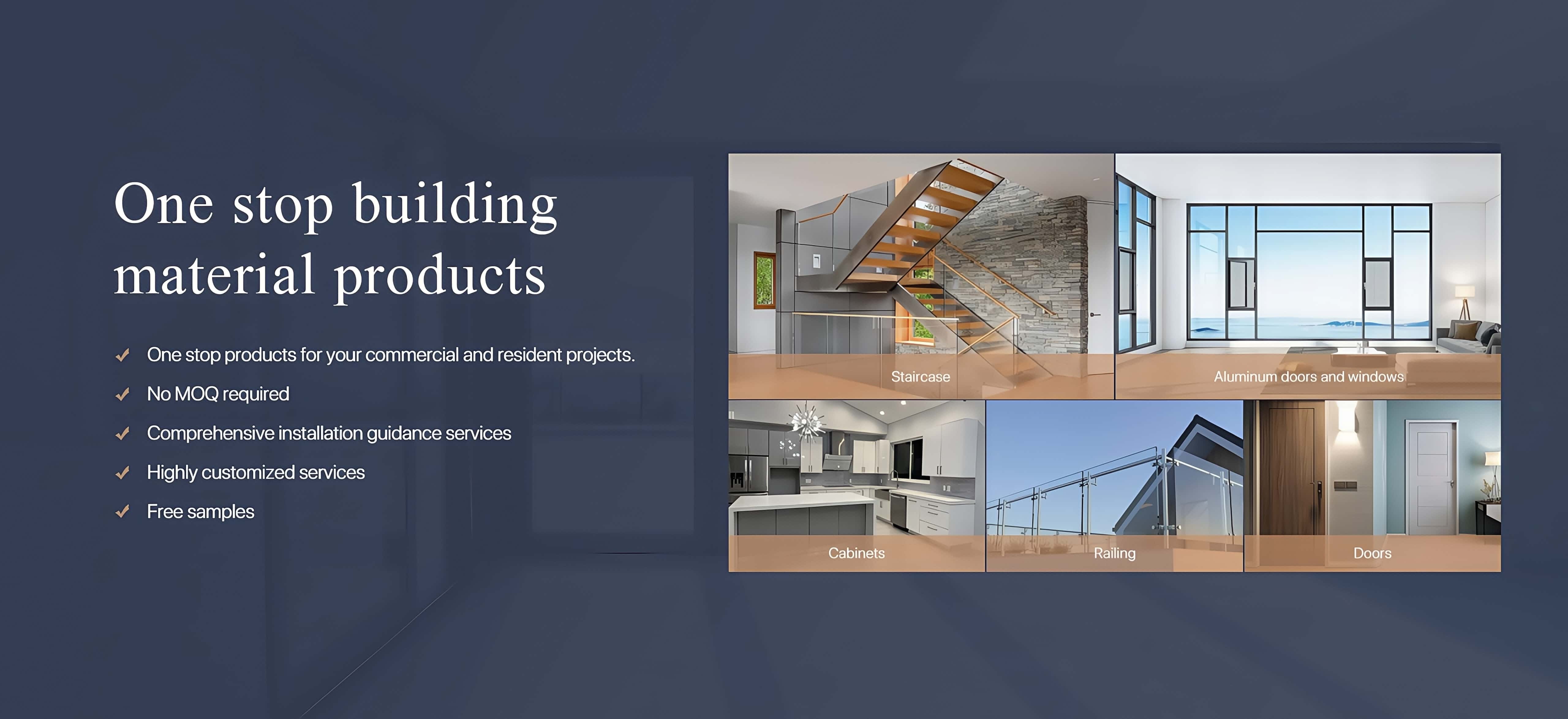One-stop for your house building materials: Staircase, railing, fencing, glasspartition, kitchen cabinet, wardrobe, vanities, TV stands, glass showers, window,door in various designs. All can be customized.