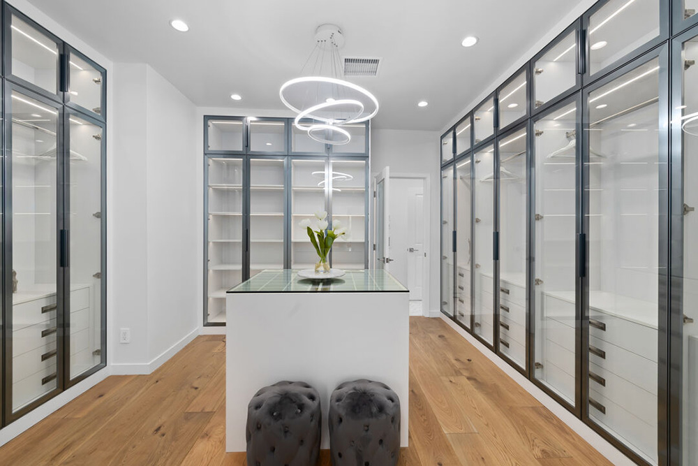Built-in closet with aluminum frame glass doors, all kinds of functianl hardware and dividers to meet different stroage needs. Central island for keeping jewelry and small objects.