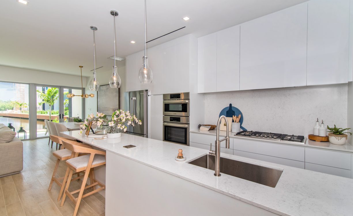 The handle-less cabinet door panels make the entire space tidy. Simple beauty seems more advanced