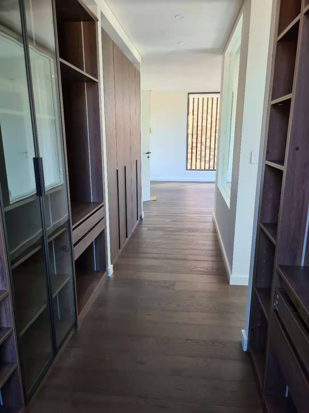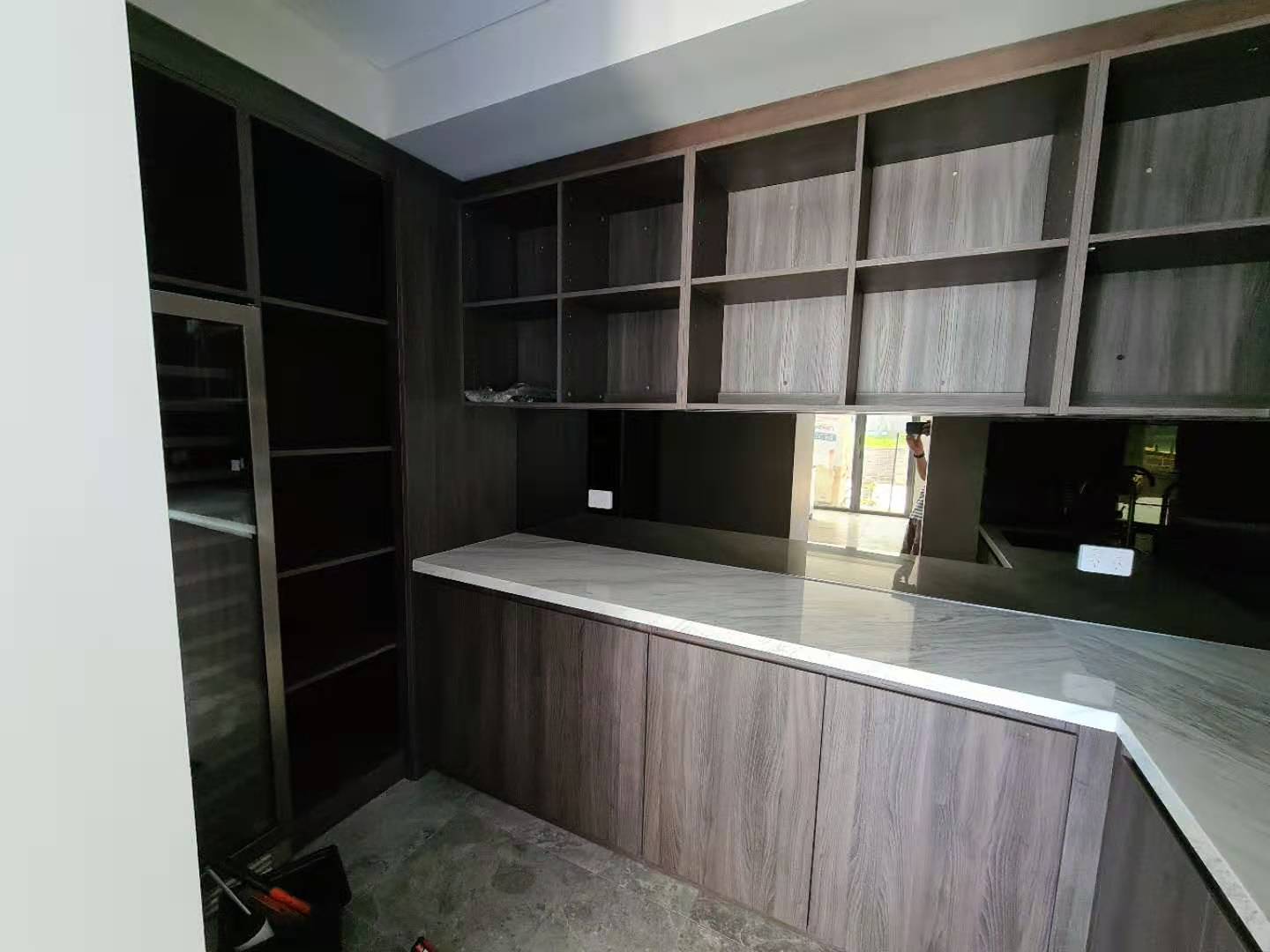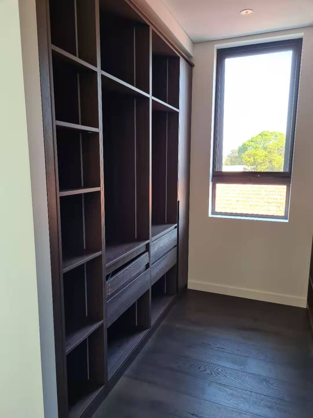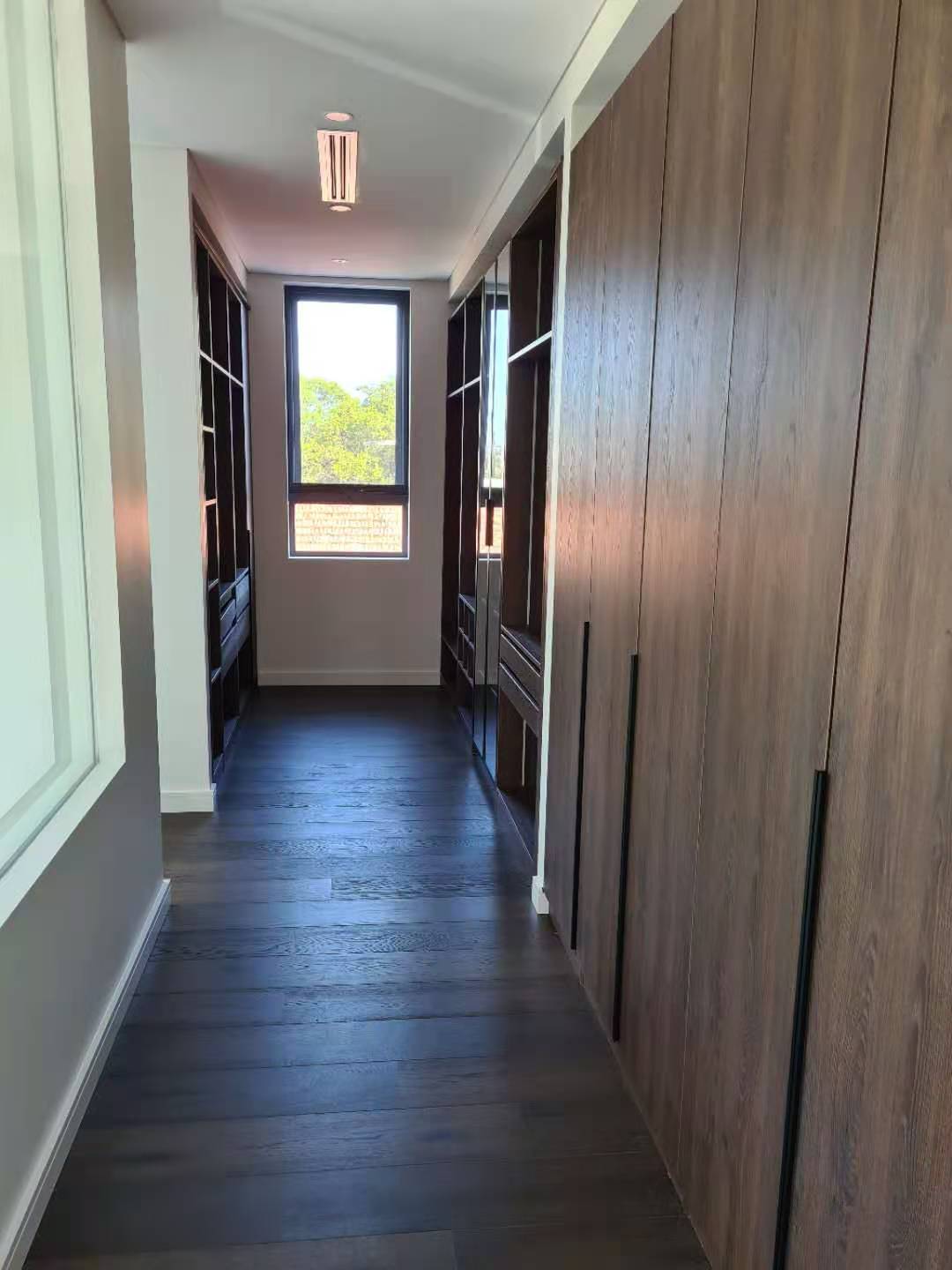 It is a minimalist villa whole house project for a Australian customer. The living room, kitchen, vanity and closet look broader and more luminous, featuring a suitable area of wood grauin cabinets and some dark wood open cabinets.